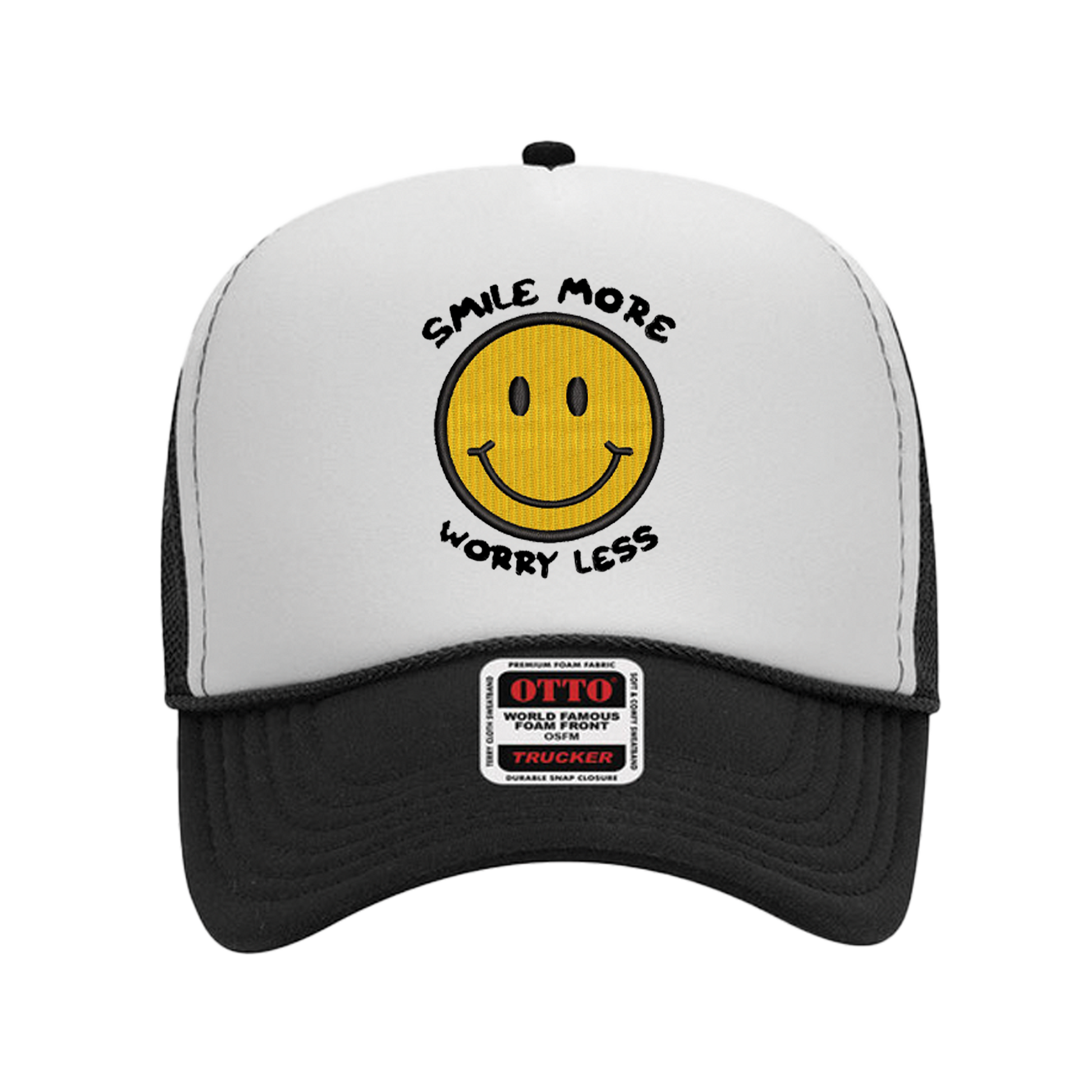 Featuring our "Smile More, Worry Less" high quality embroidered design, on our 5 Panel mesh back Trucker Hat.